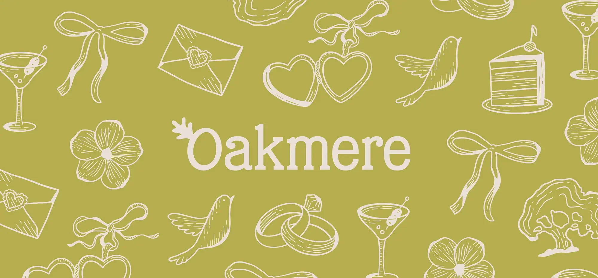 Oakmere is een trouwlocatie midden in Park Oosterhout. Ze zochten een illustratieve stijl die het avontuurlijke van de locatie laat zien en tegelijkertijd past bij het speciale en feestelijke aspect van een trouwdag.